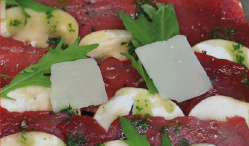 Le carpaccio de boeuf au champignons de paris, parmesan et huile de persil maison