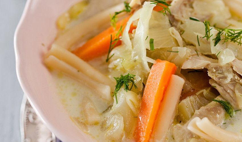 Présentez le bouillon dégraissé trempé sur du pain de campagne émincé, présentez en même temps la crème fraîche aigrie de quelques gouttes de citron.