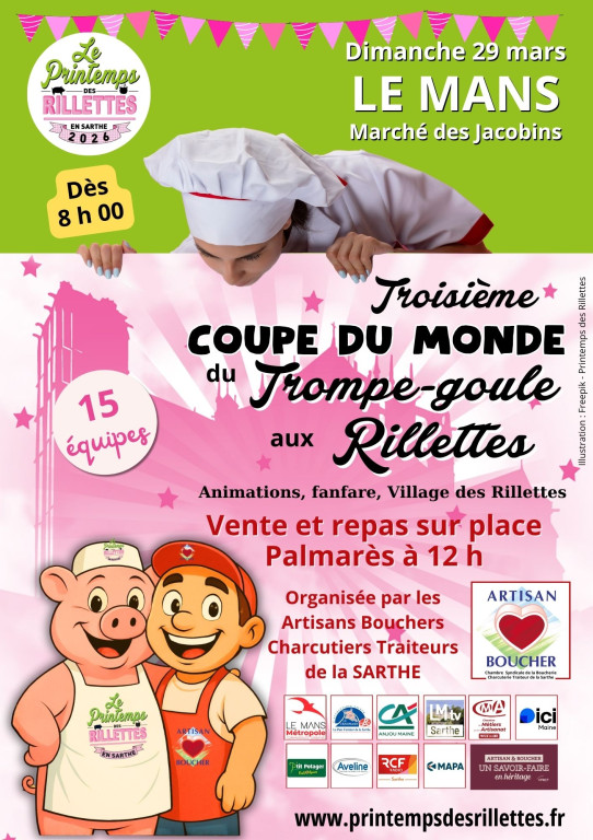 Lors de la 9ème édition du Printemps des Rillettes 2026, l'Organisation Professionnelle de la Boucherie Charcuterie Traiteur de la Sarthe organise la 3ème Coupe du Monde du Trompe Goule aux Rillettes.