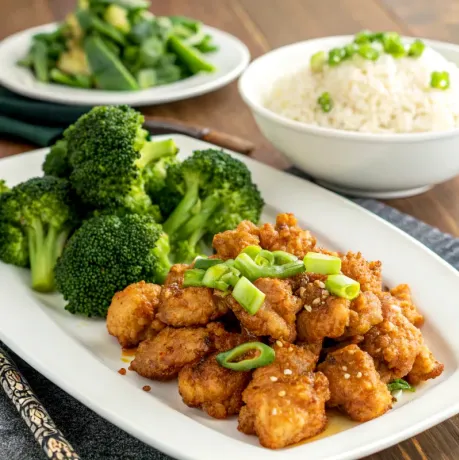 Préparation : Commencez par couper les blancs de poulet en cubes de taille moyenne. Enrobez-les de maïzena. Faites chauffer l'huile dans une friteuse ou une grande poêle. Faites frire les morceaux de poulet jusqu'à ce qu'ils soient dorés et croustillants. Pendant ce temps, préparez la sauce. Dans une poêle, mélangez tous les ingrédients de la sauce et faites chauffer à feu moyen jusqu'à épaississement. Ajoutez ensuite le poulet frit à la sauce et mélangez bien pour enrober chaque morceau. Servez immédiatement avec du riz blanc et des brocolis vapeur.